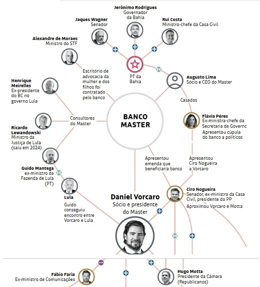 Segundo a Folha, todos eles têm ligação direta com a rede de influência do Banco Master, incluindo o próprio presidente Lula.