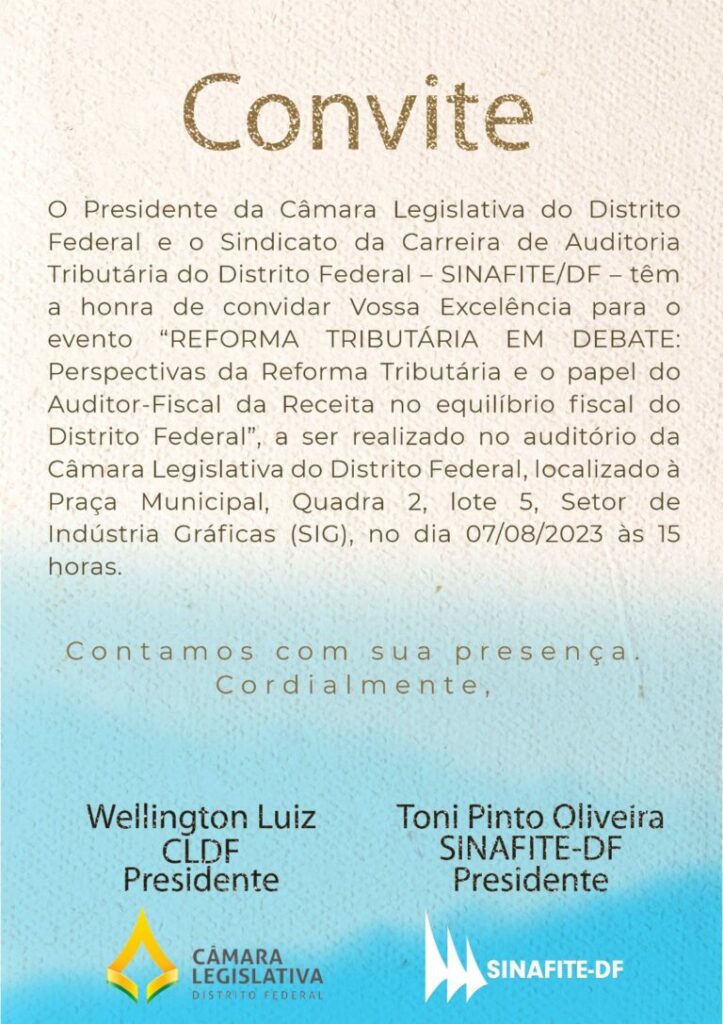 Hoje, segunda-feira (7), A Câmara Legislativa realiza, em parceria com o Sindicato da Carreira de Auditoria Tributária do DF (Sinafite/DF), o evento “Reforma Tributária em Debate: perspectivas da reforma tributária e o papel do auditor fiscal da receita no equilíbrio fiscal do Distrito Federal”.