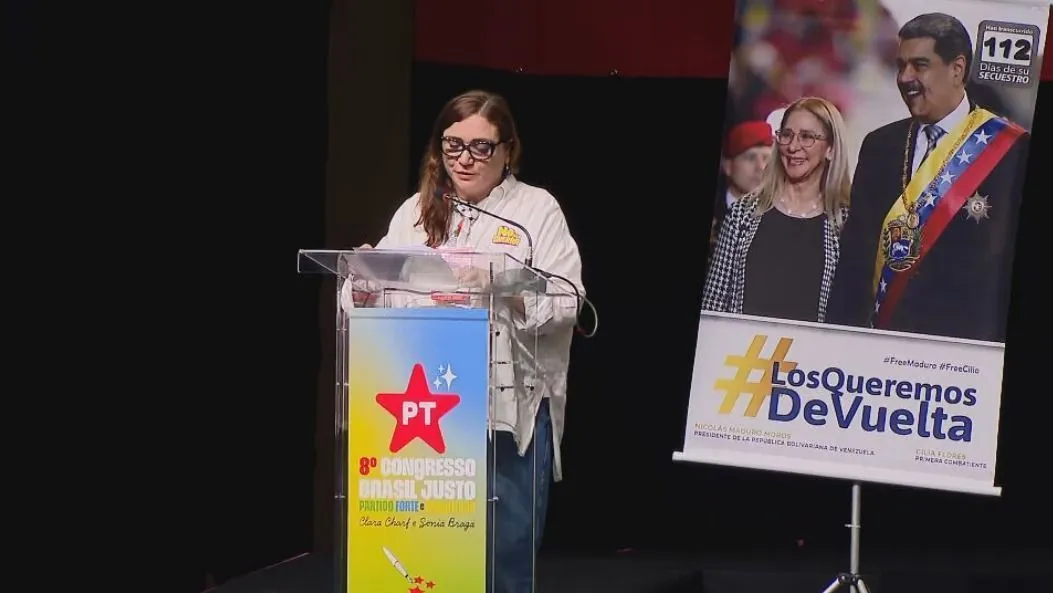 Um banner exposto no Congresso Nacional do PT (Partido dos Trabalhadores), que acontece desde a sexta-feira (24) em Brasília, pediu a volta de Nicolás Maduro e de sua esposa, Cilia Flores, à Venezuela.