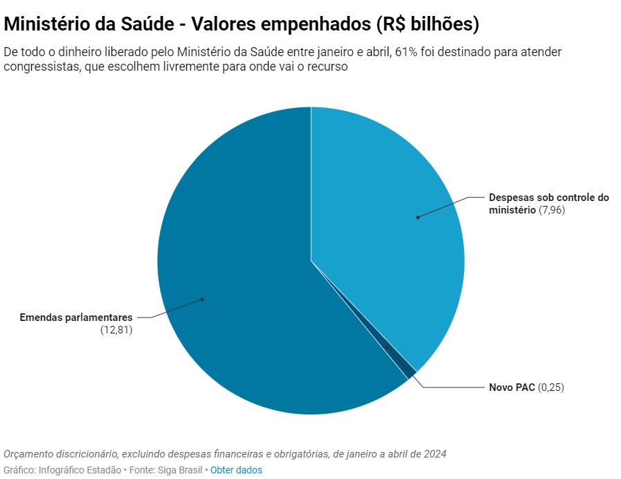 Se todo o orçamento do ano inteiro for levado em conta, as emendas representam 37% das despesas do Ministério da Saúde. Ou seja, nos quatro primeiros meses do ano, o governo deu prioridade às indicações parlamentares, que tiveram 61% dos valores empenhados. Procurados, a Presidência da República, a Secretaria de Relações Institucionais e a do Ministério da Saúde não responderam.