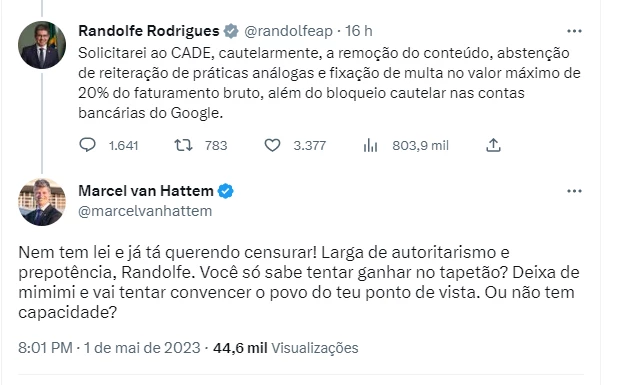 – Nem tem lei e já tá querendo censurar! Larga de autoritarismo e prepotência, Randolfe. Você só sabe tentar ganhar no tapetão? Deixa de mimimi e vai tentar convencer o povo do teu ponto de vista. Ou não tem capacidade? – questionou Marcel em uma publicação de Randolfe no Twitter.